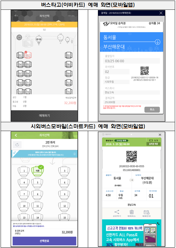 ② (지정좌석제 및 전자승차권 확대) 고속버스 예매서비스와 같이 전체노선의 모든 차량에 대해 지정좌석제를 도입되며, 좌석을 예매한 승객은 예매 시 발급(별도출력 또는 모바일앱 저장)받은 전자승차권(QR코드)만 있으면 별도의 현장발권 없이 즉시 탑승이 가능해진다.