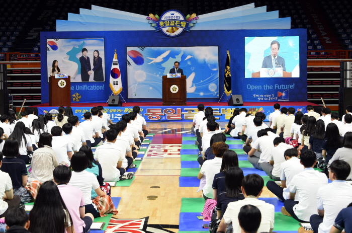 김석준 부산광역시교육감이 18일 오후 1시 부산사직실내체육관에서 고등학생 437명이 참가한 가운데 민주평화통일자문회의 부산지역회의 주최로 열린 ‘통일골든벨 부산지역대회’에서 참가학생들을 격려하고 있다.