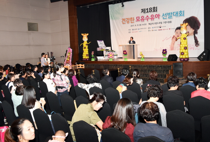 김석준 부산광역시교육감이 31일 오후 2시 해운대그랜드호텔 그랜드볼룸에서 열린 ‘제18회 건강한 모유수유아 선발대회’에서 인사말을 하고 참가한 아기 및 부모들과 기념촬영을 하고 있다.