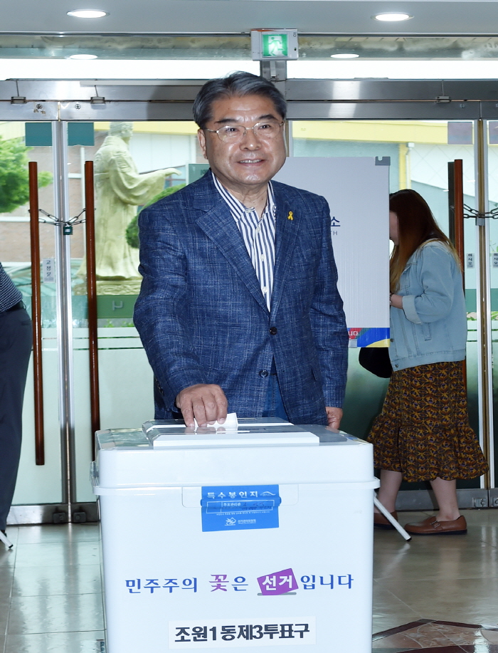이재정 경기도교육감이 9일 오전 제 19대 대통령 선거일을 맞아 수원시 장안구 조원1동 소재 영화초등학교에 마련된 제3투표소에서 투표를 하고 있다.