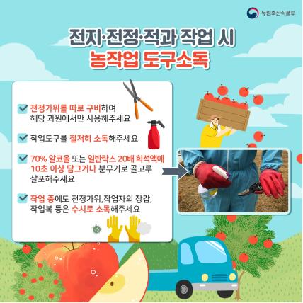 전지·전정 작업 시에는 가위, 장갑 등 작업 도구를 철저히 소독하여 사용하고 가급적 해당 과원에서만 사용