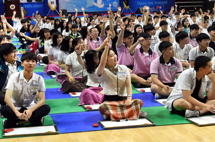 김석준 부산광역시교육감이 18일 오후 1시 부산사직실내체육관에서 고등학생 437명이 참가한 가운데 민주평화통일자문회의 부산지역회의 주최로 열린 ‘통일골든벨 부산지역대회’에서 참가학생들을 격려하고 있다.