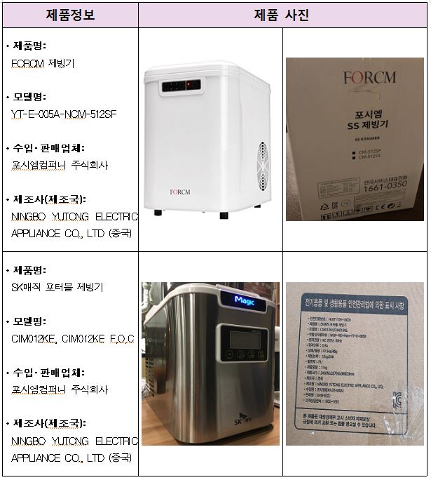 회수 대상은 포시엠컴퍼니 주식회사에서 수입·판매한 SK매직 포터블 제빙기, 전기 제빙기, FORCM 제빙기 등 4종이다.