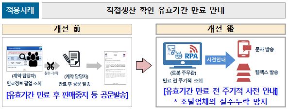 RPA 도입이후에는 로봇이 직접생산 유효기간 만료 전 주기적으로 유효기간 정보조회 후 자동 안내(문자 및 팩스)하도록 하여 조달업체가 유효기간 만료 전에 ‘직접생산 증명서’를 갱신할 수 있게 됐다.